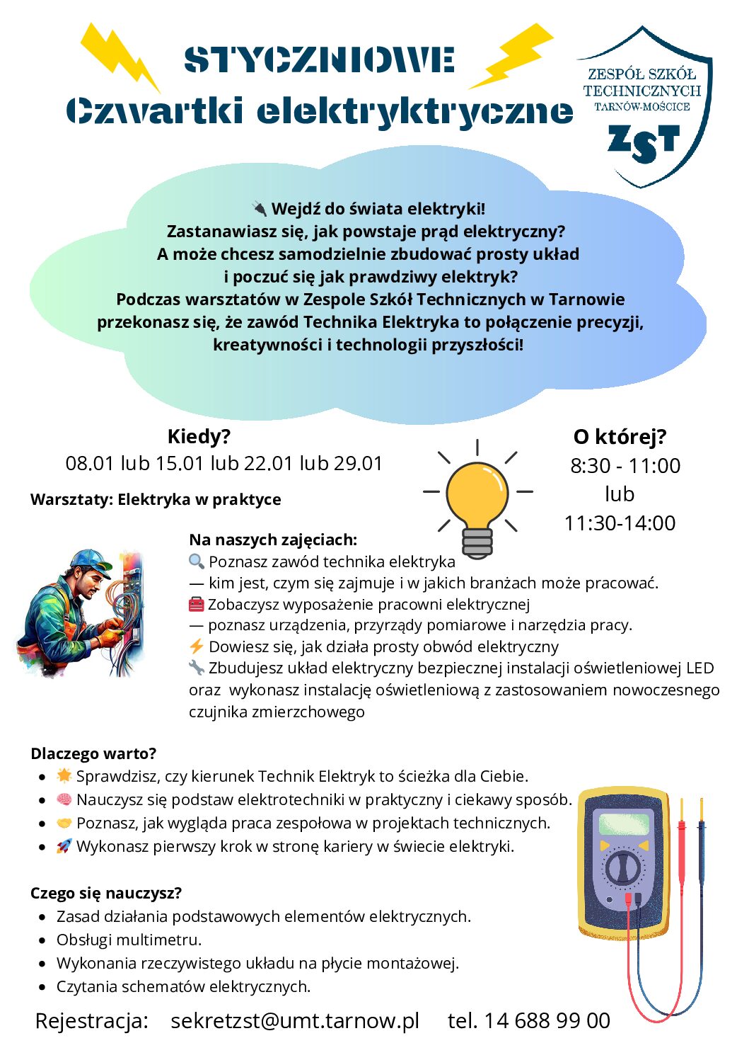 W dniu 15.01.2026 r. młodzież z SP nr 9 z Tarnowa pod opieką pani Beaty Wideł uczestniczyła w warszatatch elektrycznych. Na zajęciach praktycznych zapoznali się techniką montażu i podłączenia nowoczesnego automatu… (więcej)