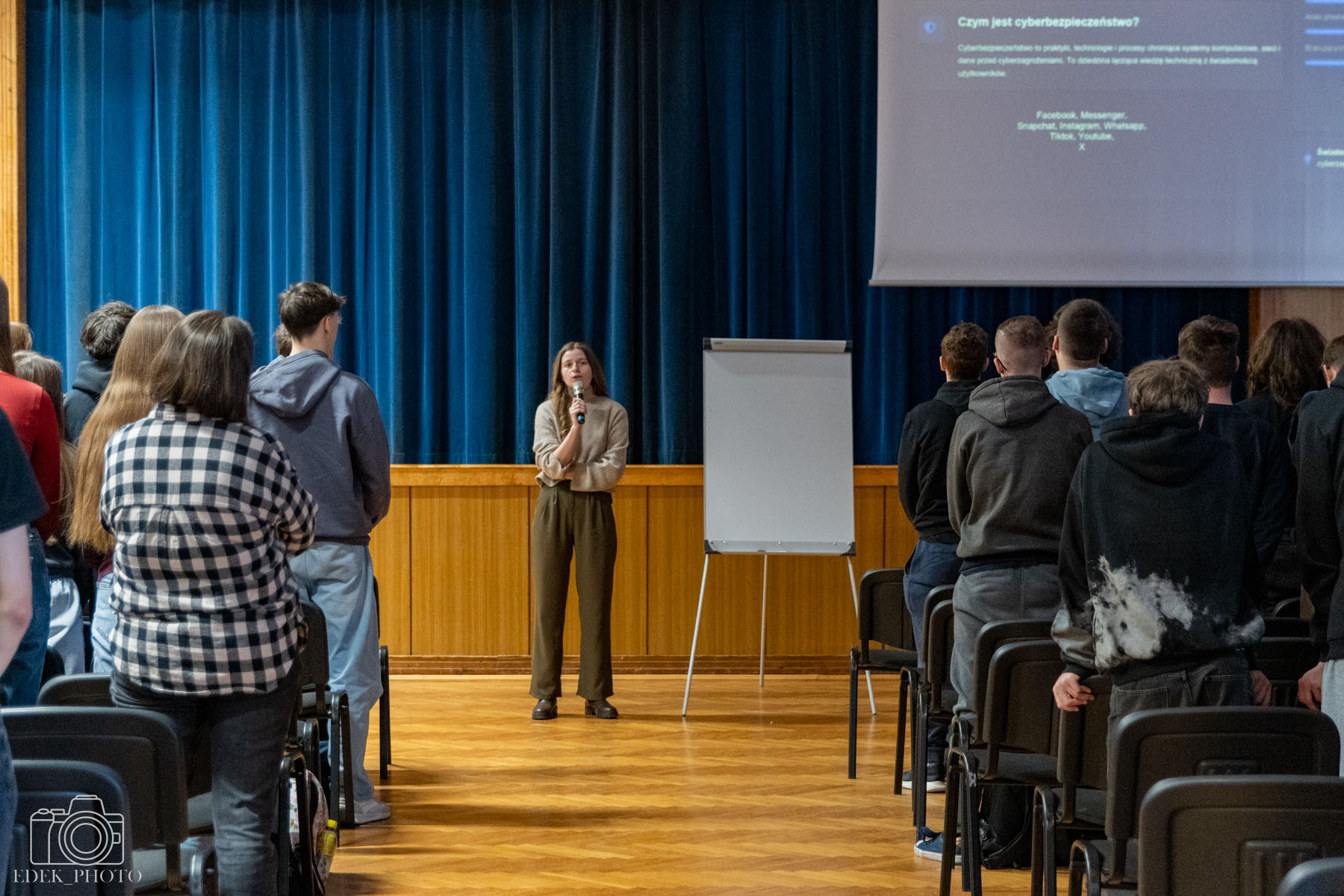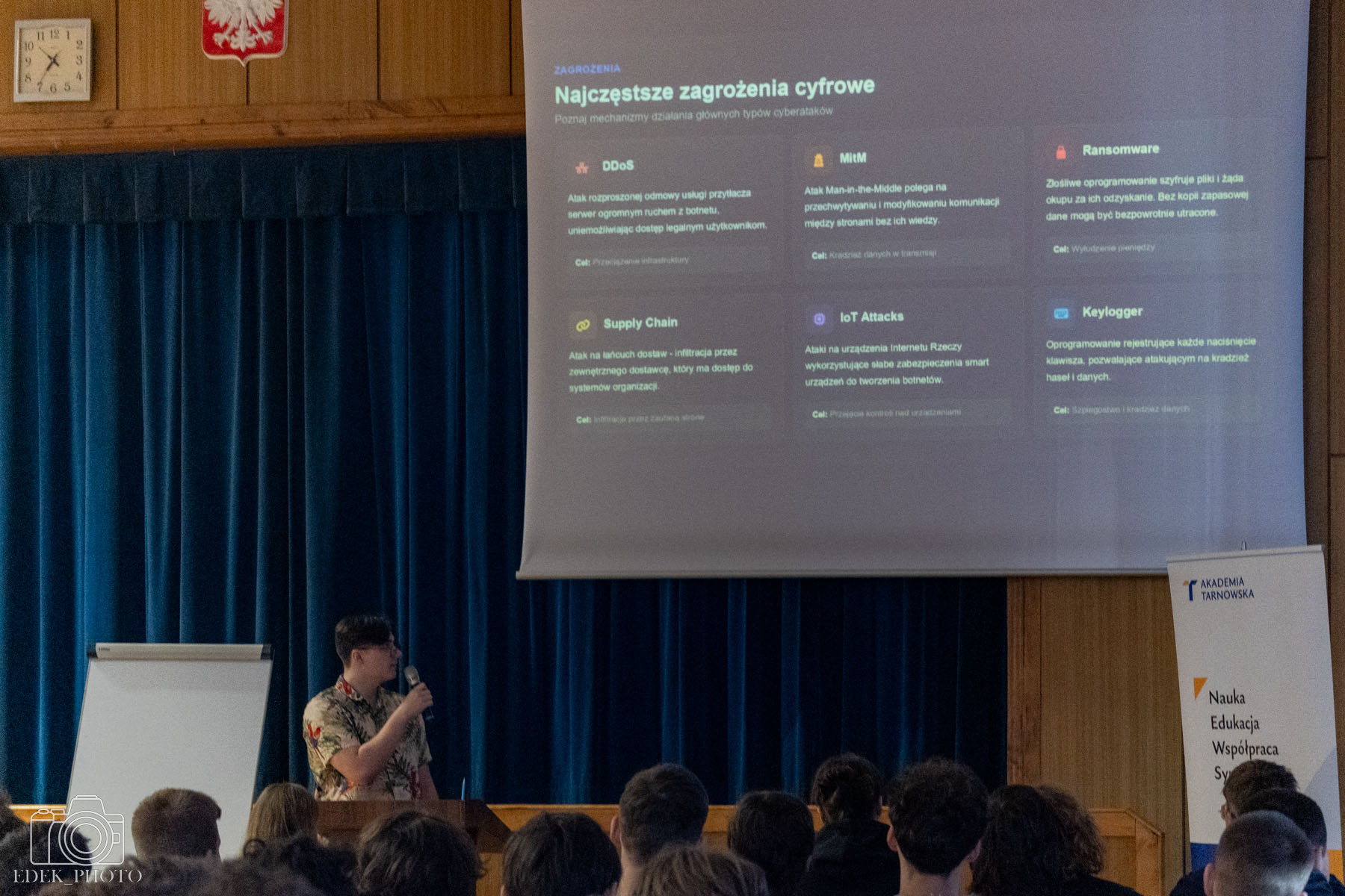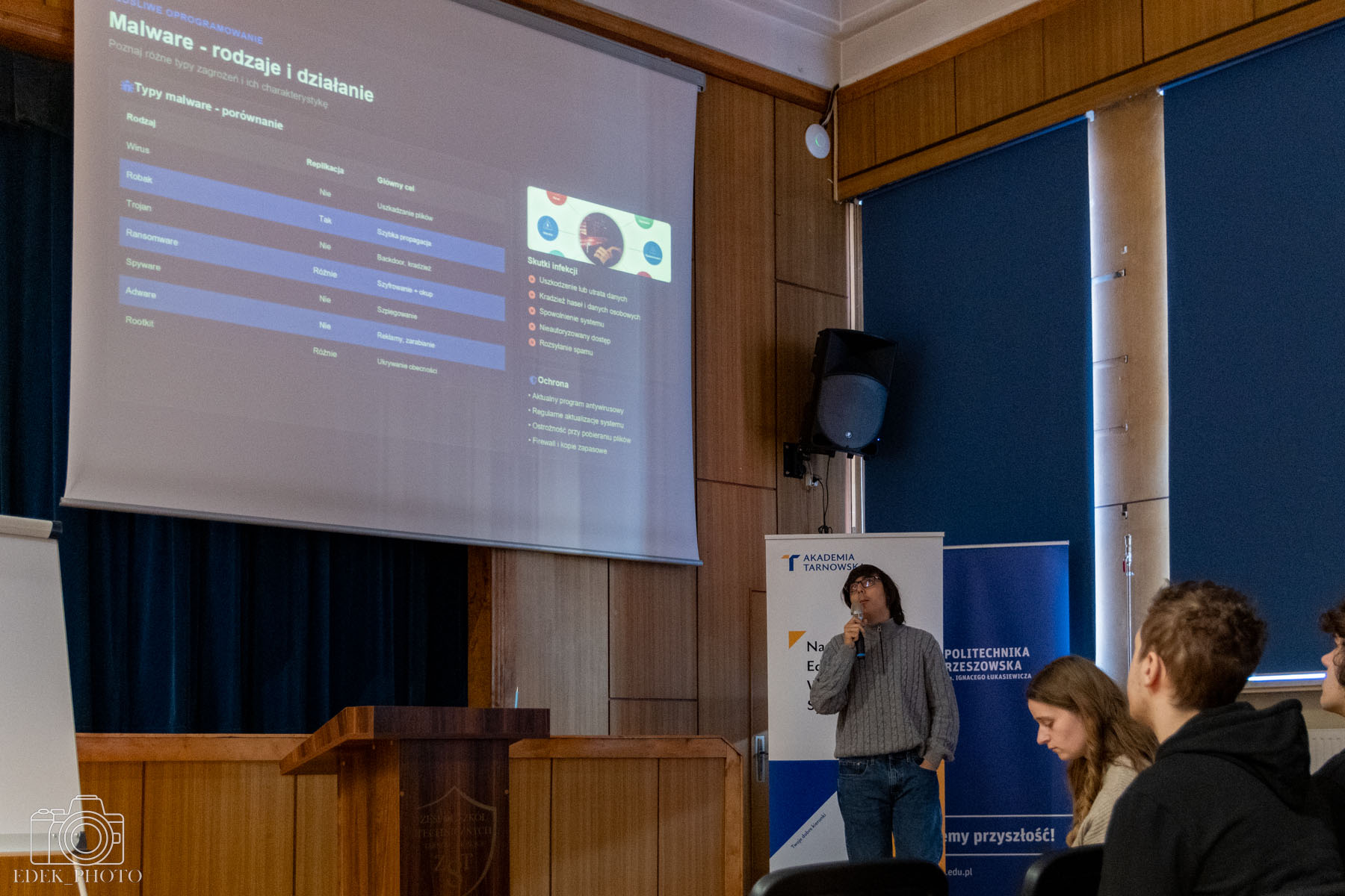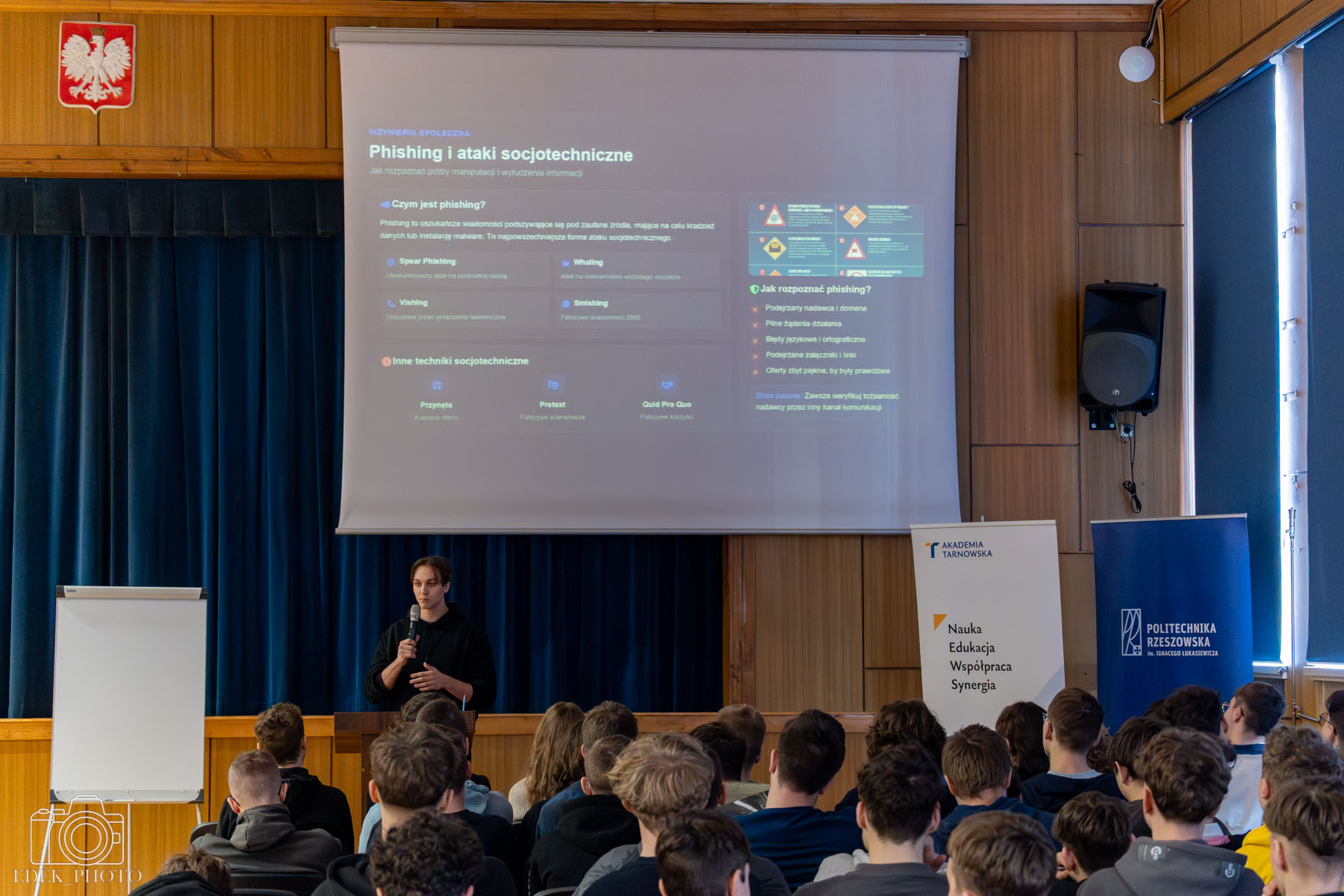 Podczas wydarzenia uczniowie klasy 4P przedstawili najważniejsze zagadnienia związane z cyberbezpieczeństwem. Omówiono m.in. czym jest phishing oraz w jaki sposób cyberprzestępcy próbują wyłudzać dane poprzez fałszywe wiadomości i strony internetowe. Uczestnicy dowiedzieli się również, jak tworzyć silne i bezpieczne hasła, poznali sposoby reagowania w sytuacji podejrzenia cyberataku oraz dowiedzieli się, jak chronić swoje dane w sieci.