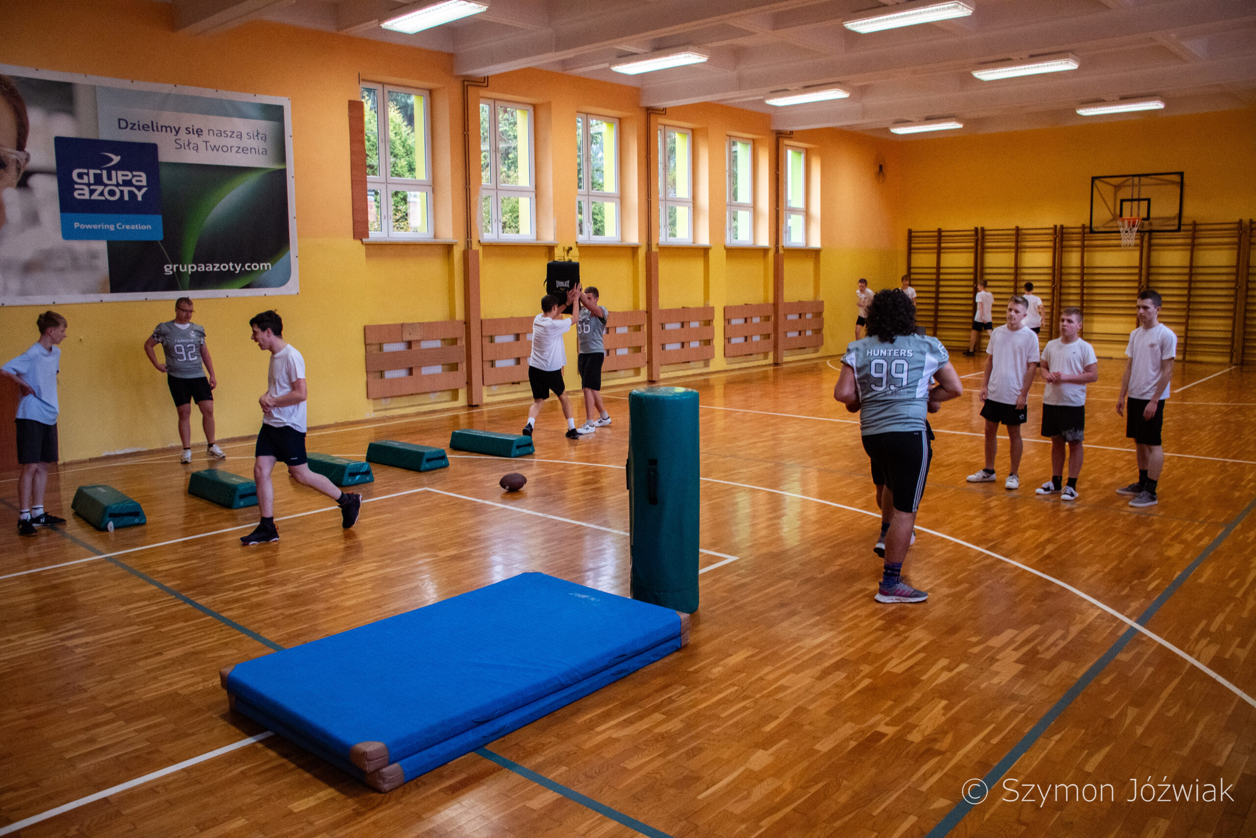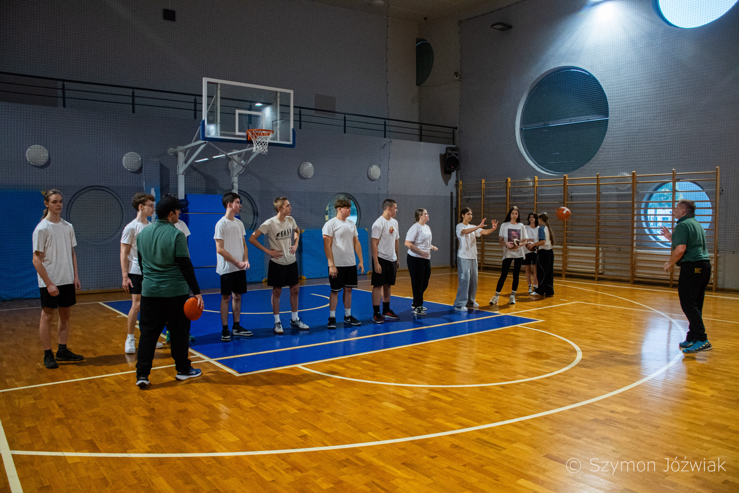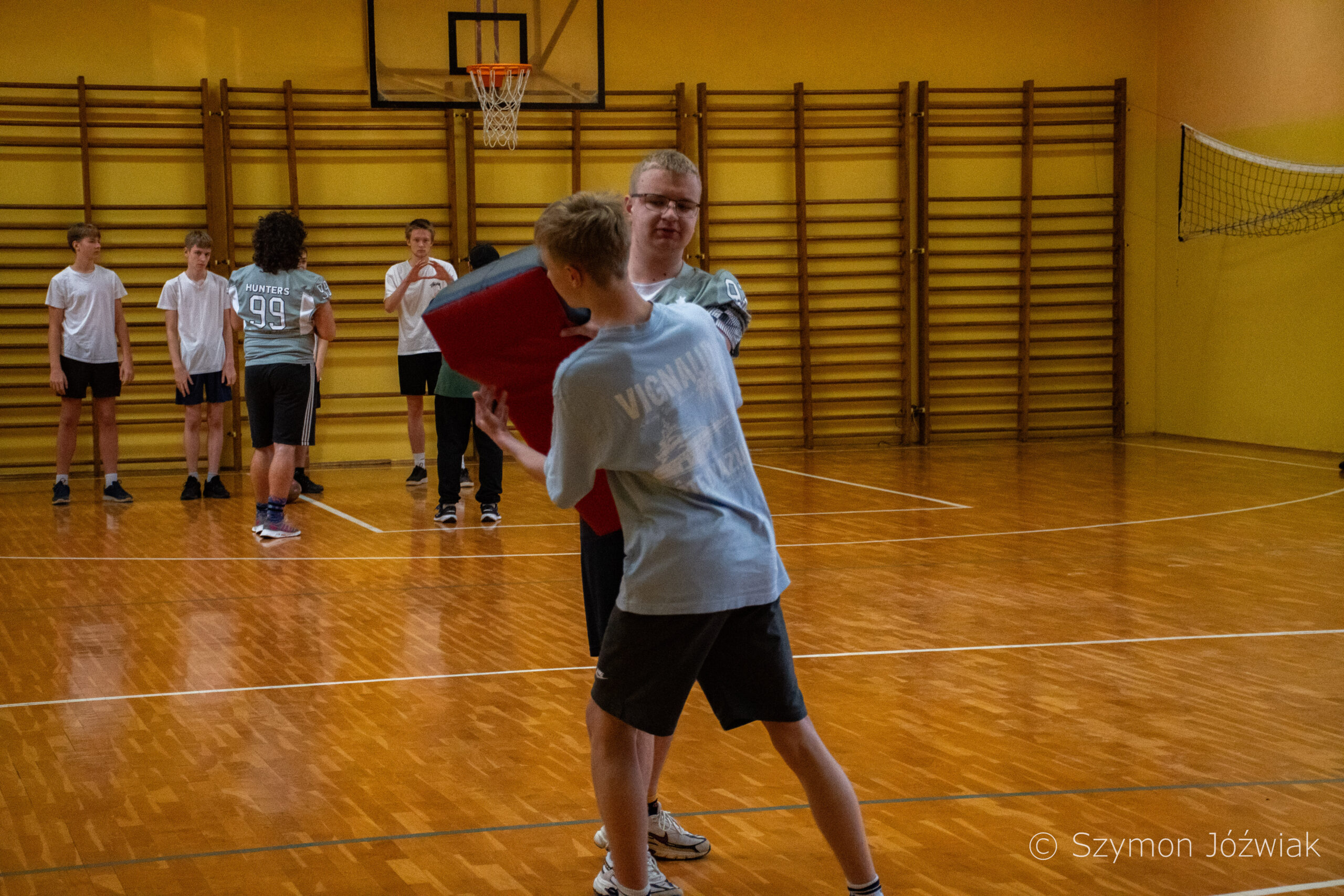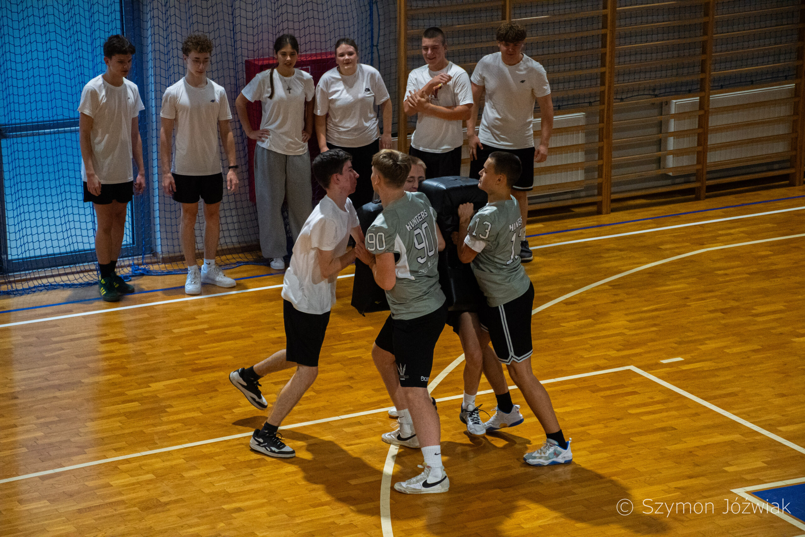 Zajęcia rozpoczęły się od wspólnej, ogólnorozwojowej rozgrzewki, po której uczniowie zostali podzieleni na trzy grupy. Każda z grup trenowała z innym zawodnikiem Hunters, ucząc się techniki rzutu piłką, chwytania jej w biegu, blokowania przeciwnika oraz ćwicząc koordynację ruchową. Zawodnicy i trenerzy dbali o to, aby każdy uczestnik wyniósł z zajęć jak najwięcej – zarówno wiedzy, jak i dobrej sportowej energii.