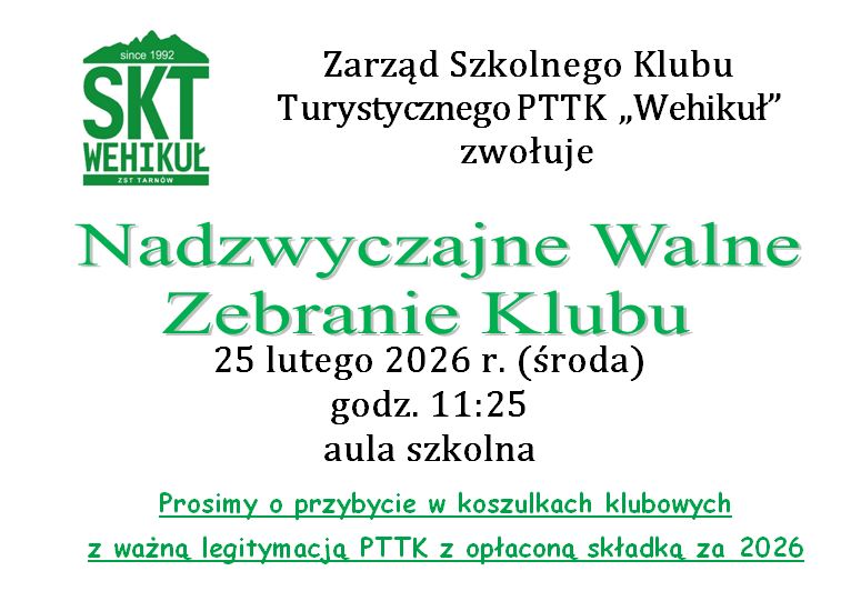 Zarząd Klubu przypomina, że w środę, 25 lutego 2026 r. o godz. 11:25 (lekcja 5) w auli szkolnej odbędzie się Nadzwyczajne Walne Zebranie Klubu mające na celu wybór delegata na Zjazd Oddziału PTTK „Ziemi Tarnowskiej” w Tarnowie, który odbędzie się 14 marca 2026 r.