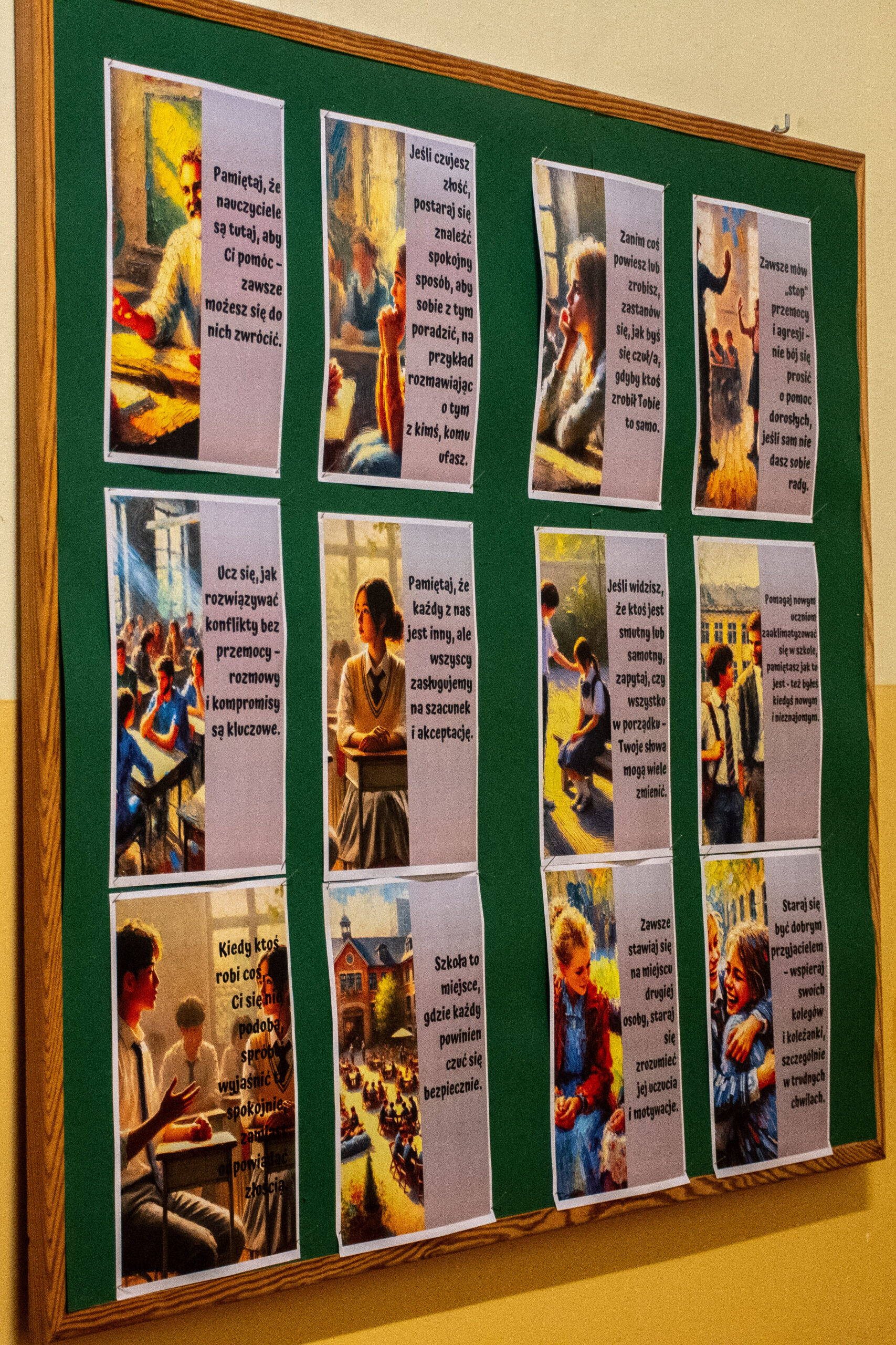 W poniedziałek została przeprowadzona kampania informacyjna. Na tablicach pojawiły się plakaty informujące o tym „Jak przeciwdziałać przemocy”. We wtorek podczas długiej przerwy zespół muzyczny zorganizował happening a z radiowęzła rozbrzmiewały antyprzemocowe przeboje. Pani psycholog przeprowadziła w klasach pogadanki na temat przeciwdziałania przemocy psychicznej. W środę członkowie Samorządu Uczniowskiego przeprowadzili w szkole akcję „Pozytywnie na Dzień dobry” witając wszystkich uczniów, nauczycieli i pracowników naszej szkoły karteczkami z pozytywnymi cytatami i ciepłymi słowami.
