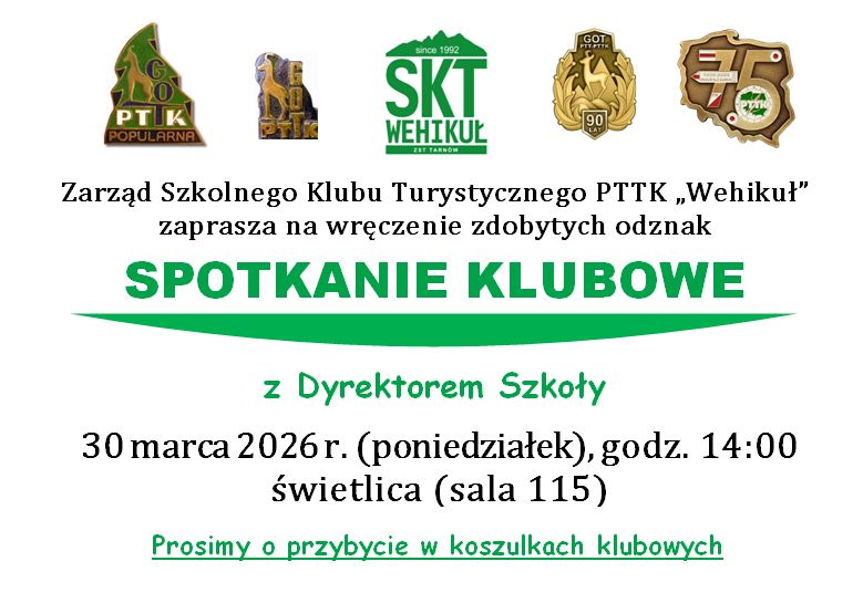 Zarząd Szkolnego Klubu Turystycznego PTTK „Wehikuł” przypomina, że w poniedziałek, 30 marca 2026 r. o godz. 14:00 w świetlicy odbędzie się SPOTKANIE KLUBOWE z Dyrektorem Szkoły Panem Jackiem Różyckim, podczas którego zostaną wręczone zdobyte przez Członków SKT w roku 2025 odznaki popularnej i małej brązowej GOT oraz jubileuszowe odznaki „90 lat GOT” i „75 lat z PTTK”.