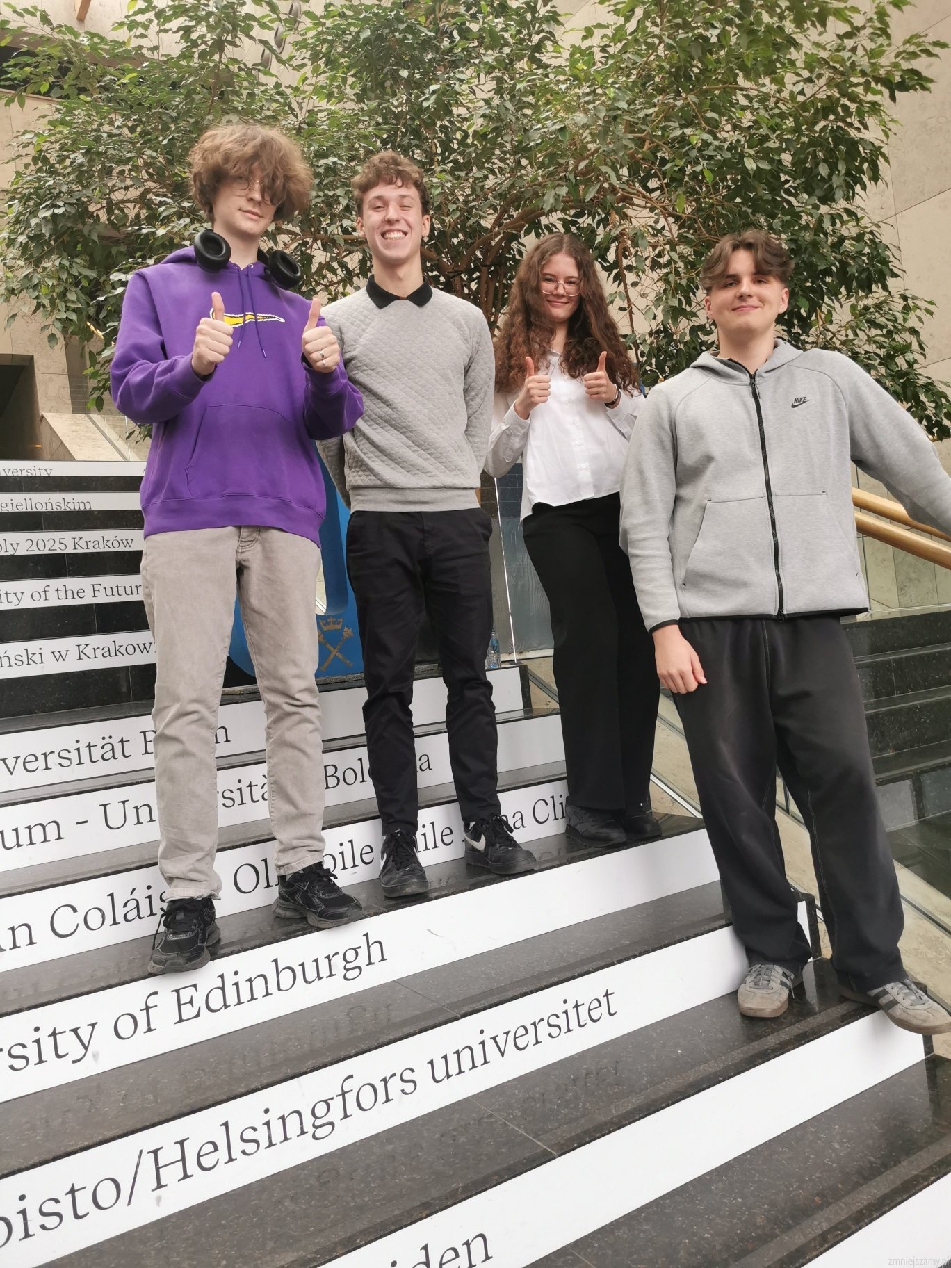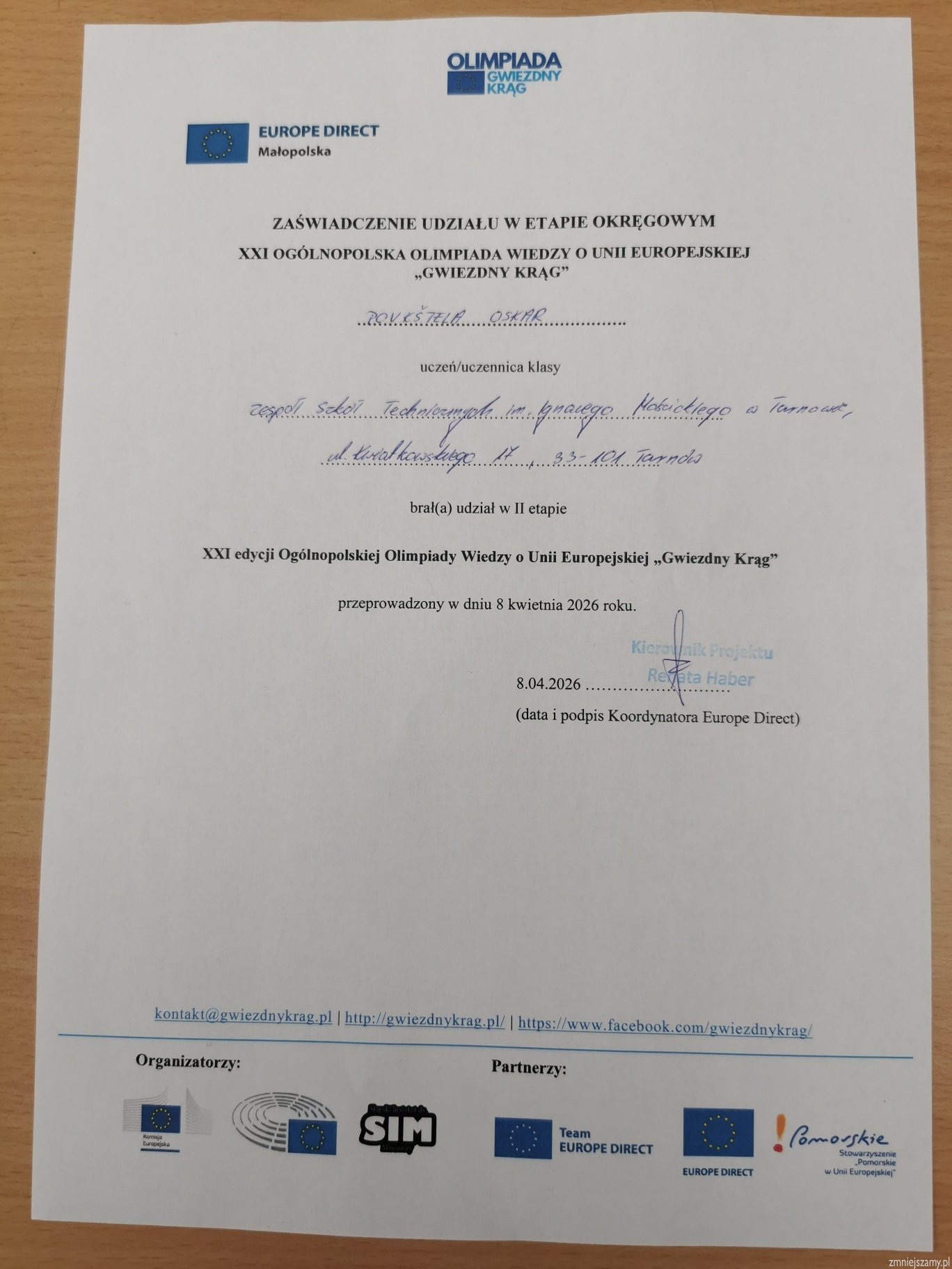 8 kwietnia 2026 roku uczniowie naszej szkoły, pod opieką nauczyciela historii i wos Sławomira Skowrona, wzięli udział w II etapie regionalnym XXI Ogólnopolskiej Olimpiady Wiedzy o Unii Europejskiej „Gwiezdny Krąg”. Konkurs ten jest skierowany do uczniów szkół ponadpodstawowych, którzy chcą pogłębiać swoją wiedzę na temat integracji europejskiej, instytucji Unii Europejskiej oraz wartości wspólnotowych. Wydarzenie, wspierane przez Przedstawicielstwo Komisji Europejskiej oraz Biuro Parlamentu Europejskiego w Polsce, jest organizowane od 2004 roku i przyciąga setki ambitnych uczestników z całej Polski. Naszą szkołę reprezentowało czworo uczniów:Wiktoria Kędzior, Oskar Povkštela, Tomasz Wrona